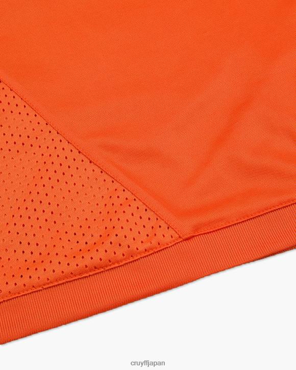 ブラッド イン ブラッド アウト X クライフの女性用クロップ トップ、オレンジ。このジャージは、ヨハン クライフが世界に感動を与えたクラシックなワールドカップ 1974 T シャツなど、さまざまなオランダ代表ジャージをマッシュアップしたものです。